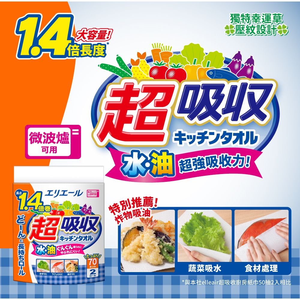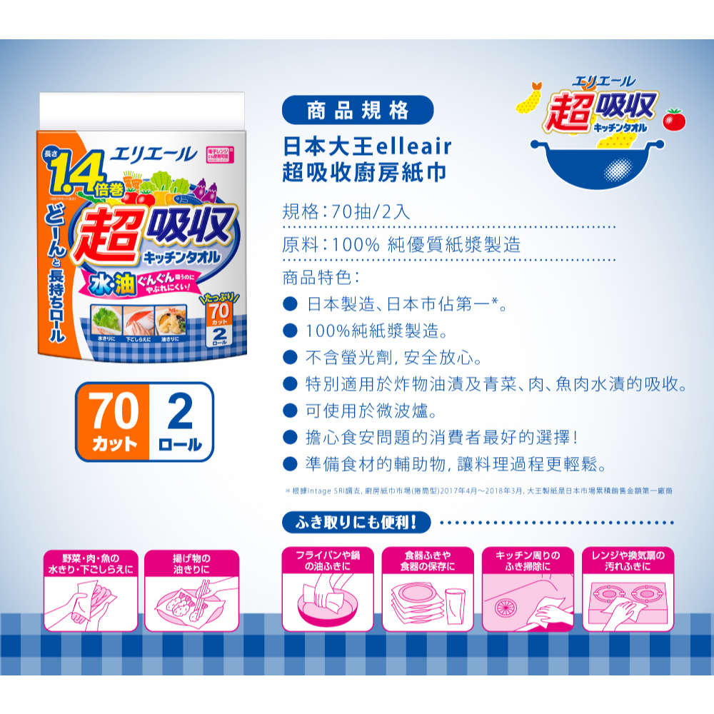日本大王elleair 超吸收廚房紙巾70抽(2入)/捲 衛生紙70抽(2入)x1Tissue & Paper Towels日本大王elleair 官方旗艦店