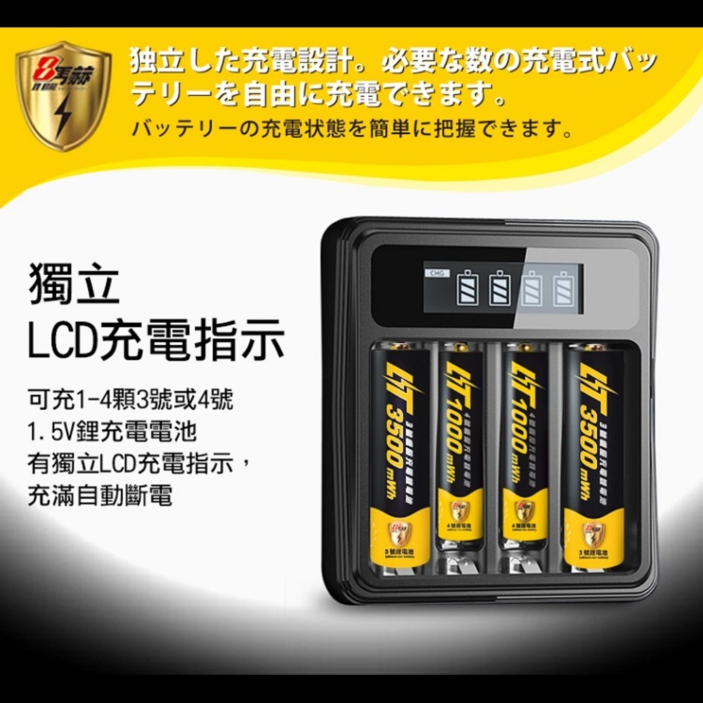【8馬赫】3號/AA 恆壓可充式1.5V鋰電池全新特大能量3700mWh4入+(3號/4號通用)液晶鋰充電器【8馬赫】3號/AA 恆壓可充式1.5V鋰電池全新特大能量3700mWh4入+(3號/4號通用)液晶鋰充電器日本KOTSURU-便利速達