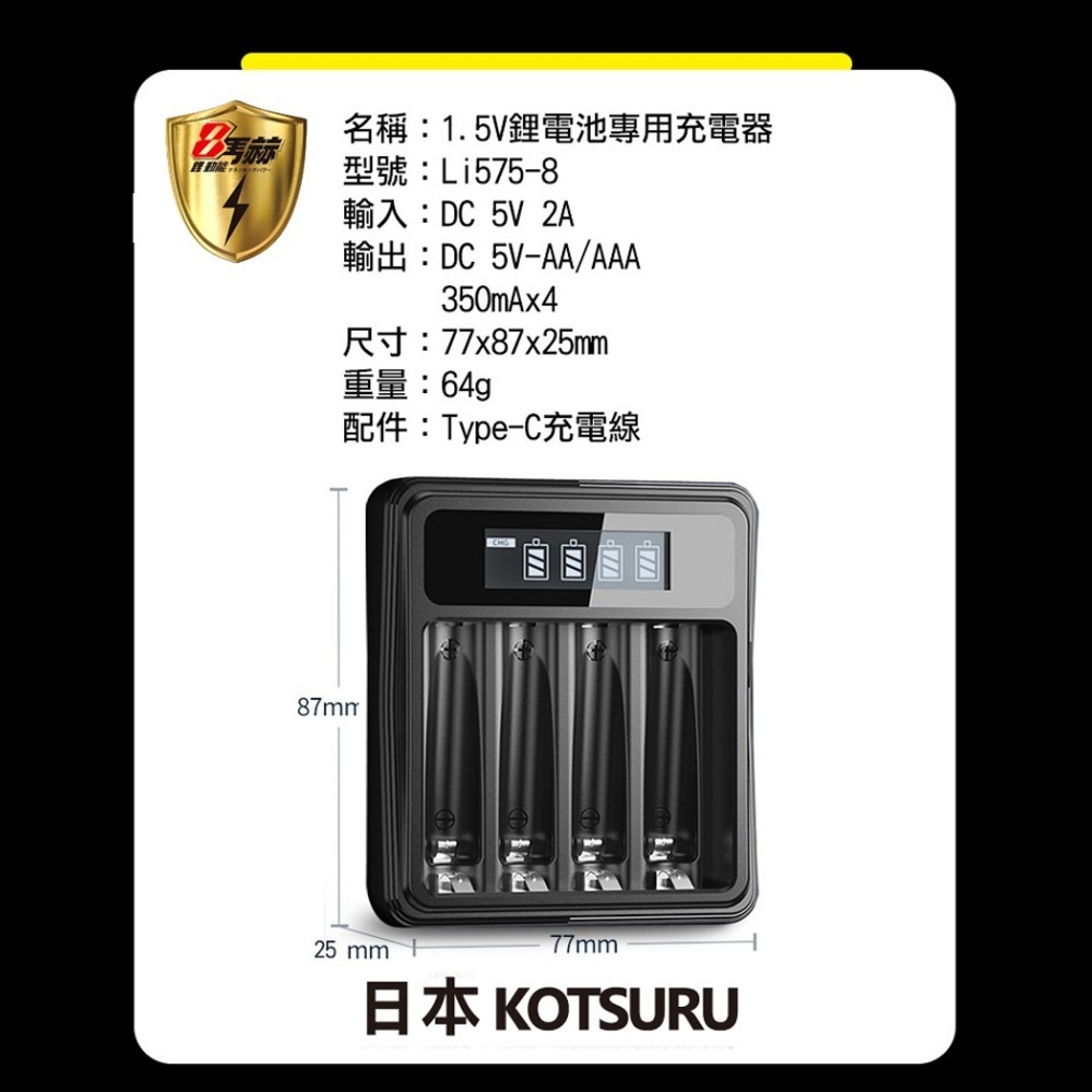 【KOTSURU】8馬赫3號/AA可充式1.5V鋰電池3500mWh 4入+專用液晶充電器組【KOTSURU】8馬赫3號/AA可充式1.5V鋰電池3500mWh 4入+專用液晶充電器組日本KOTSURU-便利速達
