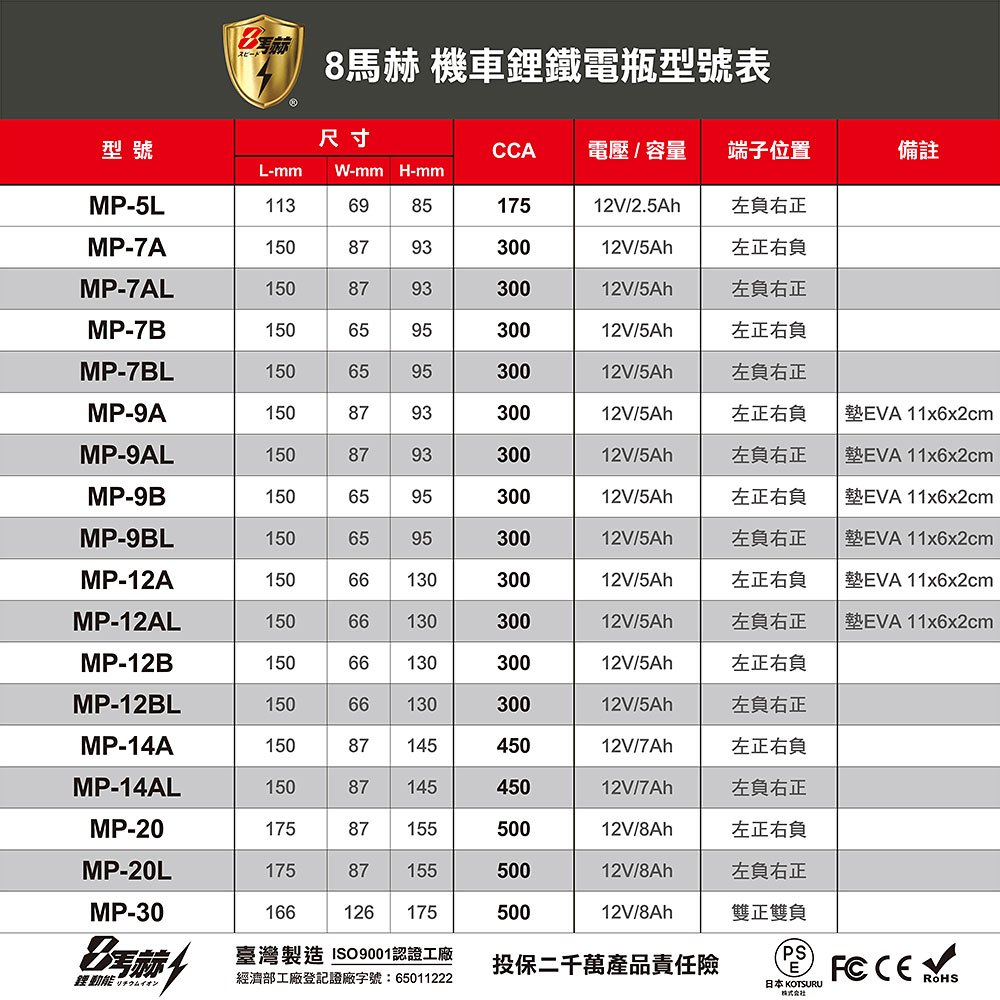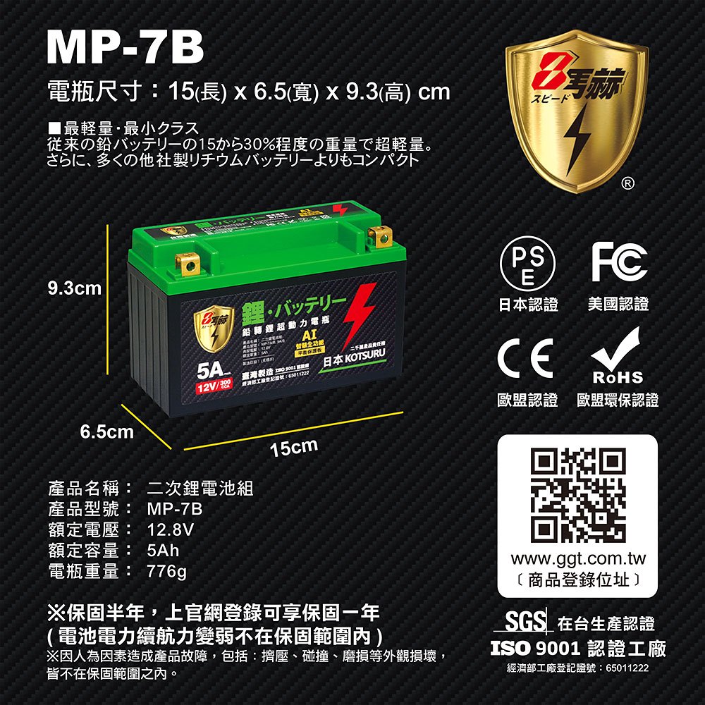 【KOTSURU】MP-7B 8馬赫 鉛轉鋰超動力機車電瓶 鋰鐵啟動電池 12V 300CCA 台灣製造【KOTSURU】MP-7B 8馬赫 鉛轉鋰超動力機車電瓶 鋰鐵啟動電池 12V 300CCA 台灣製造Batteries & Accessories日本KOTSURU-便利速達