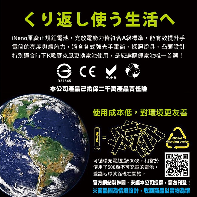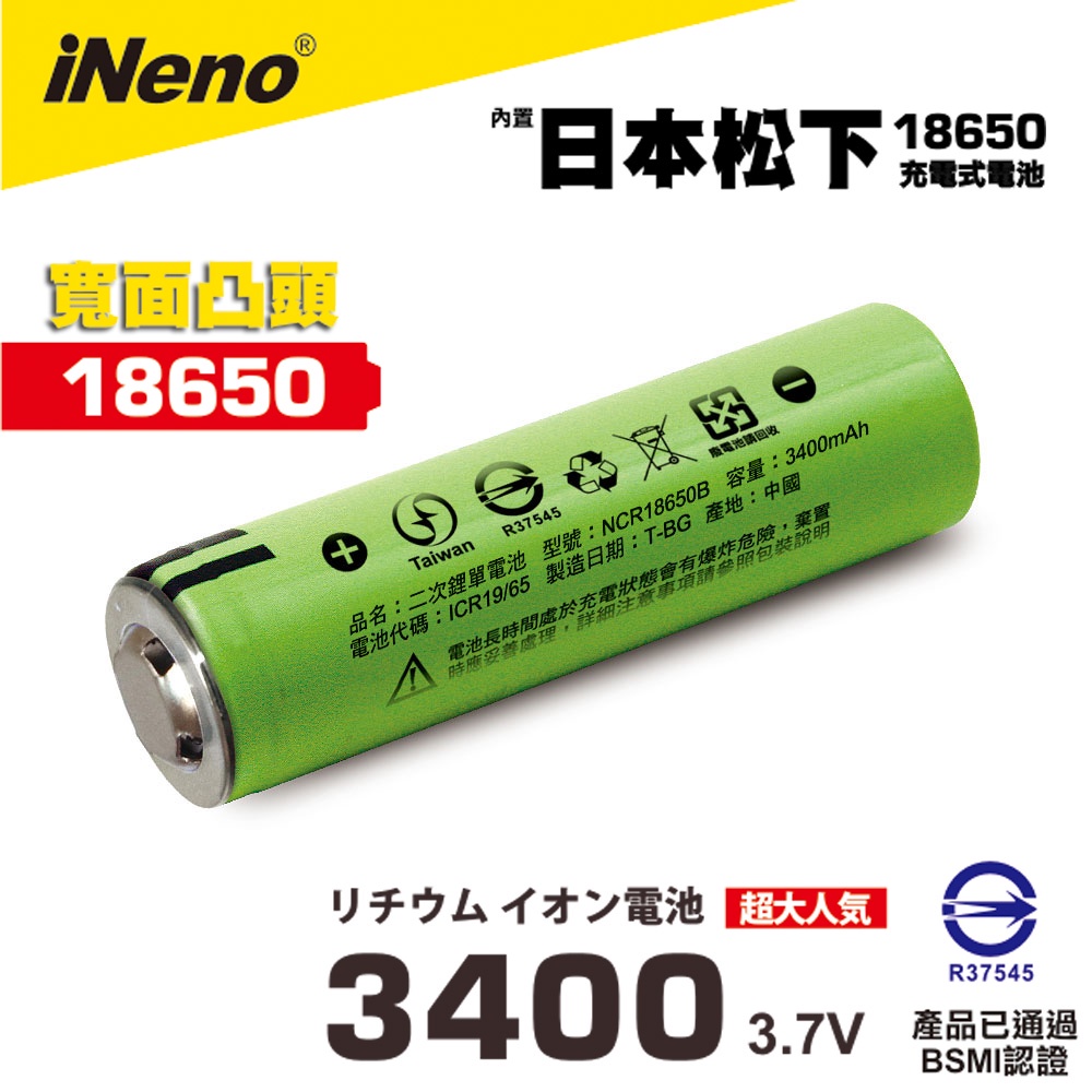 【iNeno】18650高效能鋰電池3400 內置日本松下(凸頭)2入|4入日本KOTSURU-便利速達