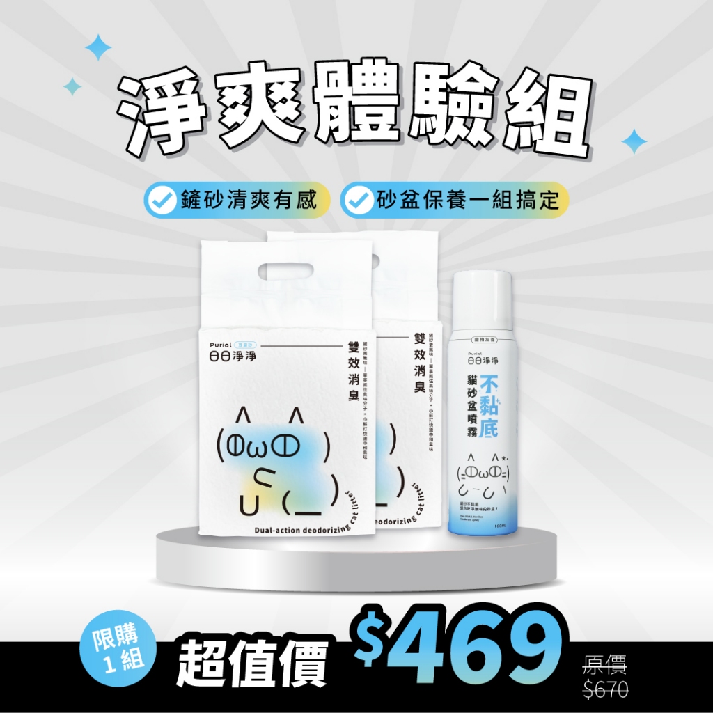 日日淨淨Purial| 超值淨爽體驗組(貓砂*2+不黏底噴霧*1)零黏木薯砂 2.35kg|極致混砂 2.4kg|米粒豆砂 2.4kg|雙效豆砂 2.7kgCat Litter & Boxes日日淨淨 Purial