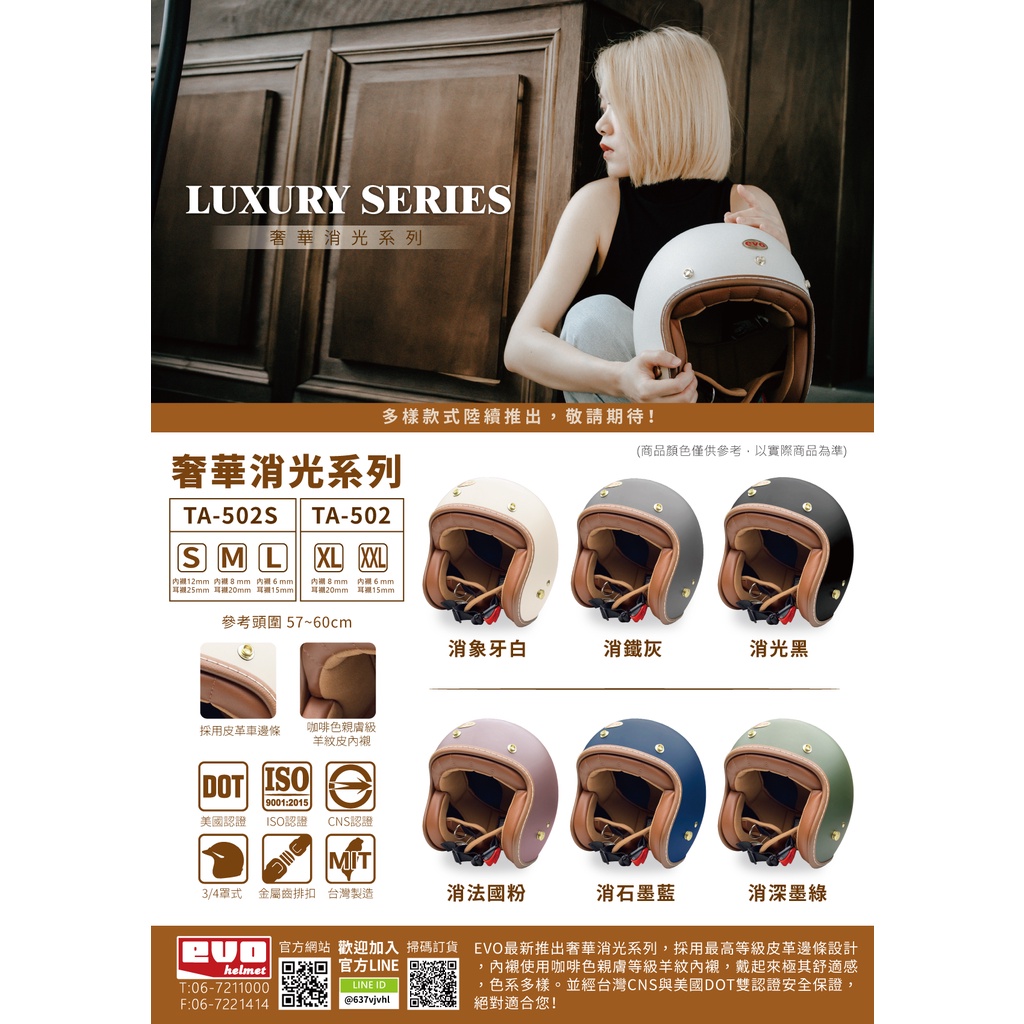 EVO 安全帽 TA502 TA502S LUXURIOUS奢華 消象牙白 車縫線邊條 金屬齒排釦 全可拆 半罩 安全帽XXL(15mm):59~60cm大帽體,三扣耐磨防水條鏡片-深黑片|S(25mm):51~52cm(小帽體),三扣耐磨防水條鏡片-深黑片|M(20mm):53~54cm(小帽體),三扣耐磨防水條鏡片-透明片|M(20mm):53~54cm(小帽體),三扣耐磨防水條鏡片-深黑片|L(15mm):55~56cm(小帽體),三扣耐磨防水條鏡片-透明片|XL(25mm):57~58cm-大帽體,三扣耐磨防水條鏡片-淺茶片|XXL(15mm):59~60cm大帽體,三扣耐磨防水條鏡片-透明片|S(25mm):51~52cm(小帽體),三扣耐磨防水條鏡片-淺茶片|M(20mm):53~54cm(小帽體),三扣耐磨防水條鏡片-淺茶片|L(15mm):55~56cm(小帽體),三扣耐磨防水條鏡片-淺茶片|L(15mm):55~56cm(小帽體),三扣耐磨防水條鏡片-深黑片|XL(25mm):57~58cm-大帽體,三扣耐磨防水條鏡片-透明片|XXL(15mm):59~60cm大帽體,三扣耐磨防水條鏡片-淺茶片|XL(25mm):57~58cm-大帽體,三扣耐磨防水條鏡片-深黑片|S(25mm):51~52cm(小帽體),三扣耐磨防水條鏡片-透明片比帽王 騎士用品專賣店
